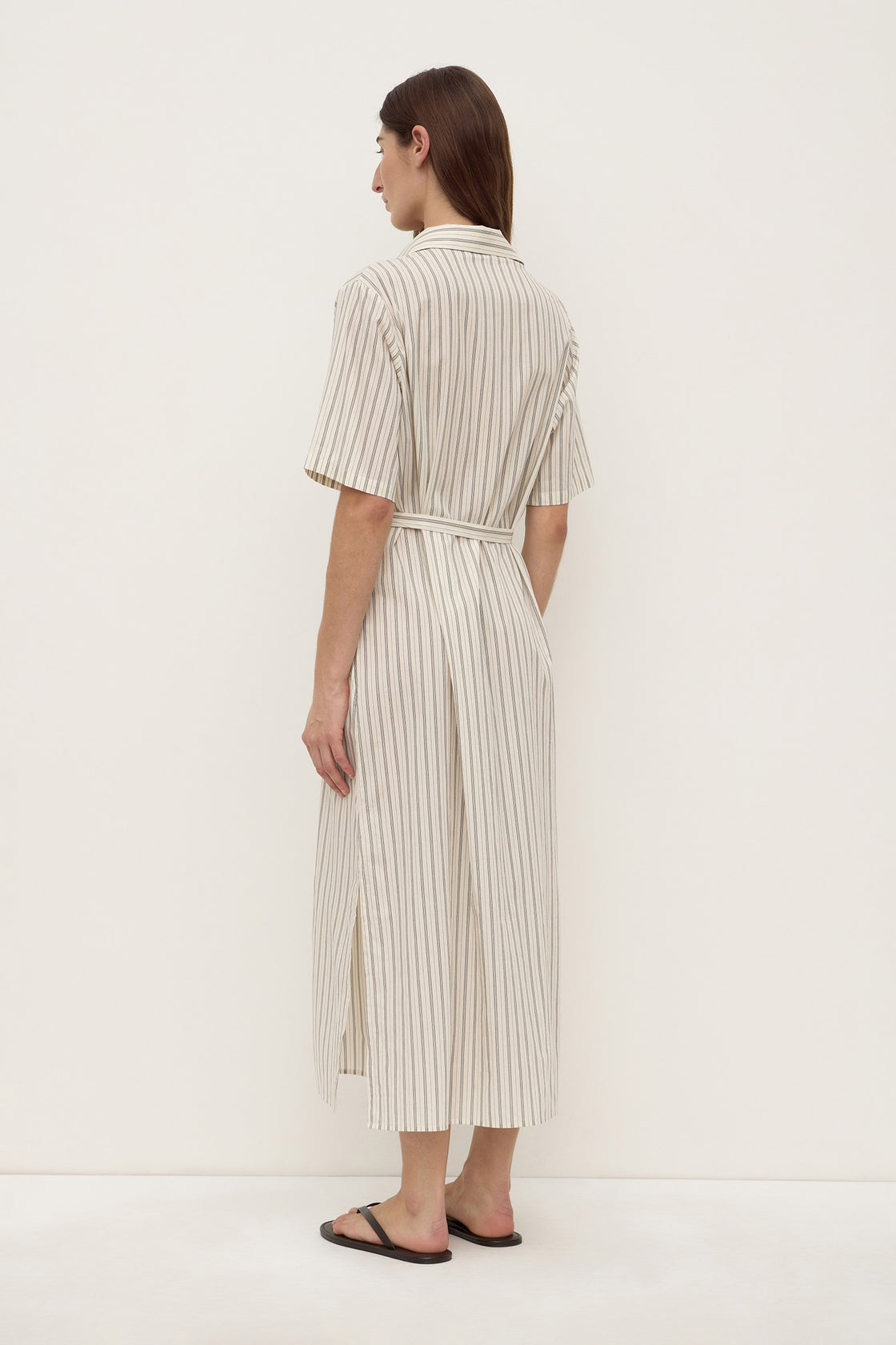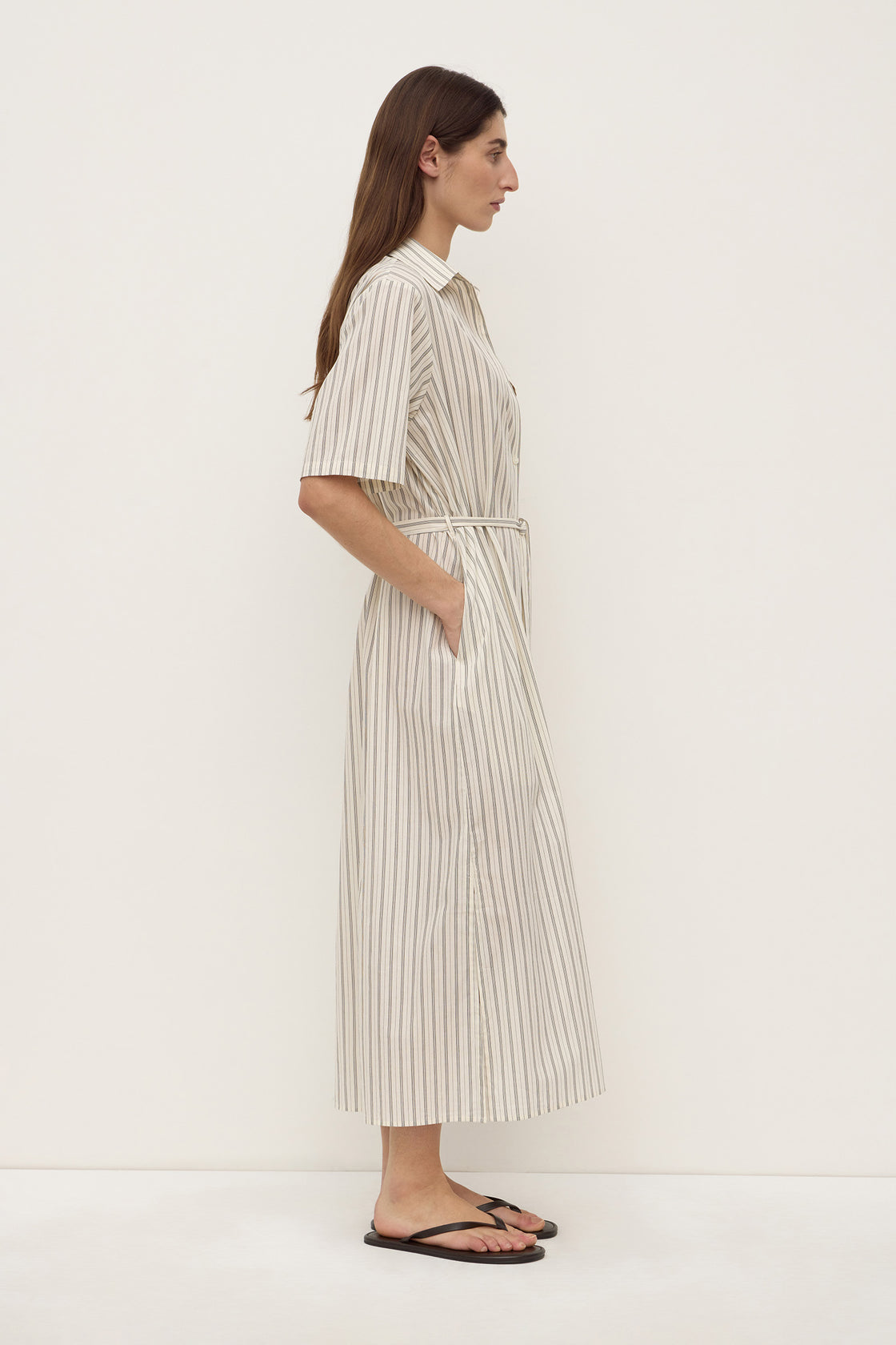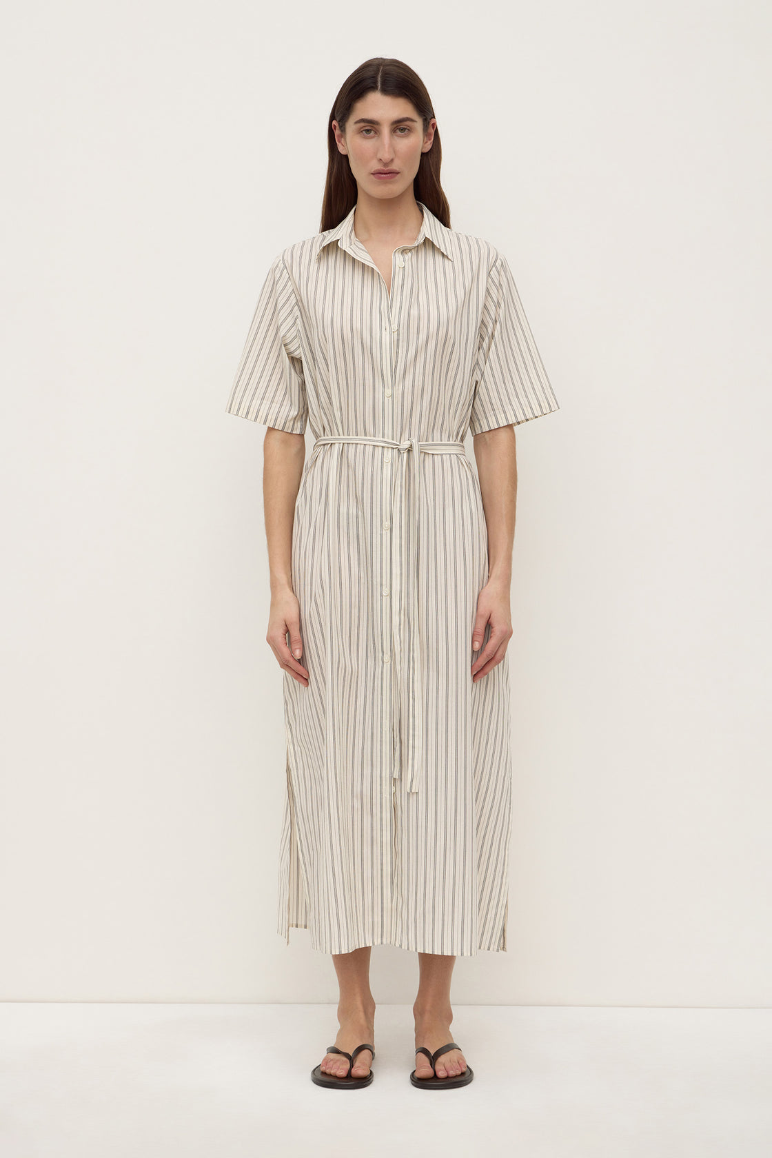 The Ria Stripe Midi Shirt Dress in Cream/Smoke is a 100% cotton midi dress with a shirt collar, button front, side seam pockets, and a waist tie belt.
