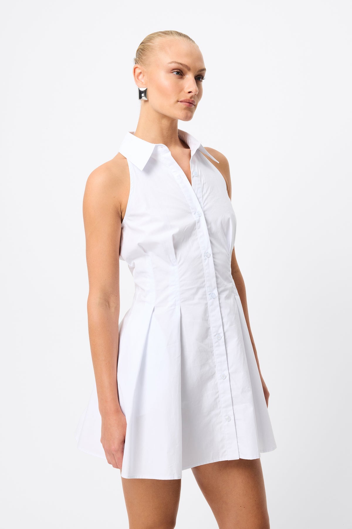 A refined interpretation of the classic shirt dress, the Roam Mini Dress in White by Mossman embodies effortless sophistication. Crafted from premium 100% cotton, this piece features a structured collared neckline, racerback detail, and a fitted bodice that flows into a semi-flared mini skirt. The stitch detailing at the fixed waist enhances the silhouette, while functional side pockets add a touch of practicality.