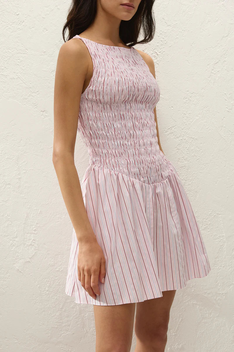 An everyday mini dress, designed from a signature 100% cotton, yarn-dyed in a nostalgic pink and red pinstripe. Sleeveless with a boat-style neckline, the bodice is shirred with a curved, gathered waist. It then falls into a soft A-line skirt that crops short on the body. With lightweight throw-on throw-off appeal, pack for your next summer vacation.