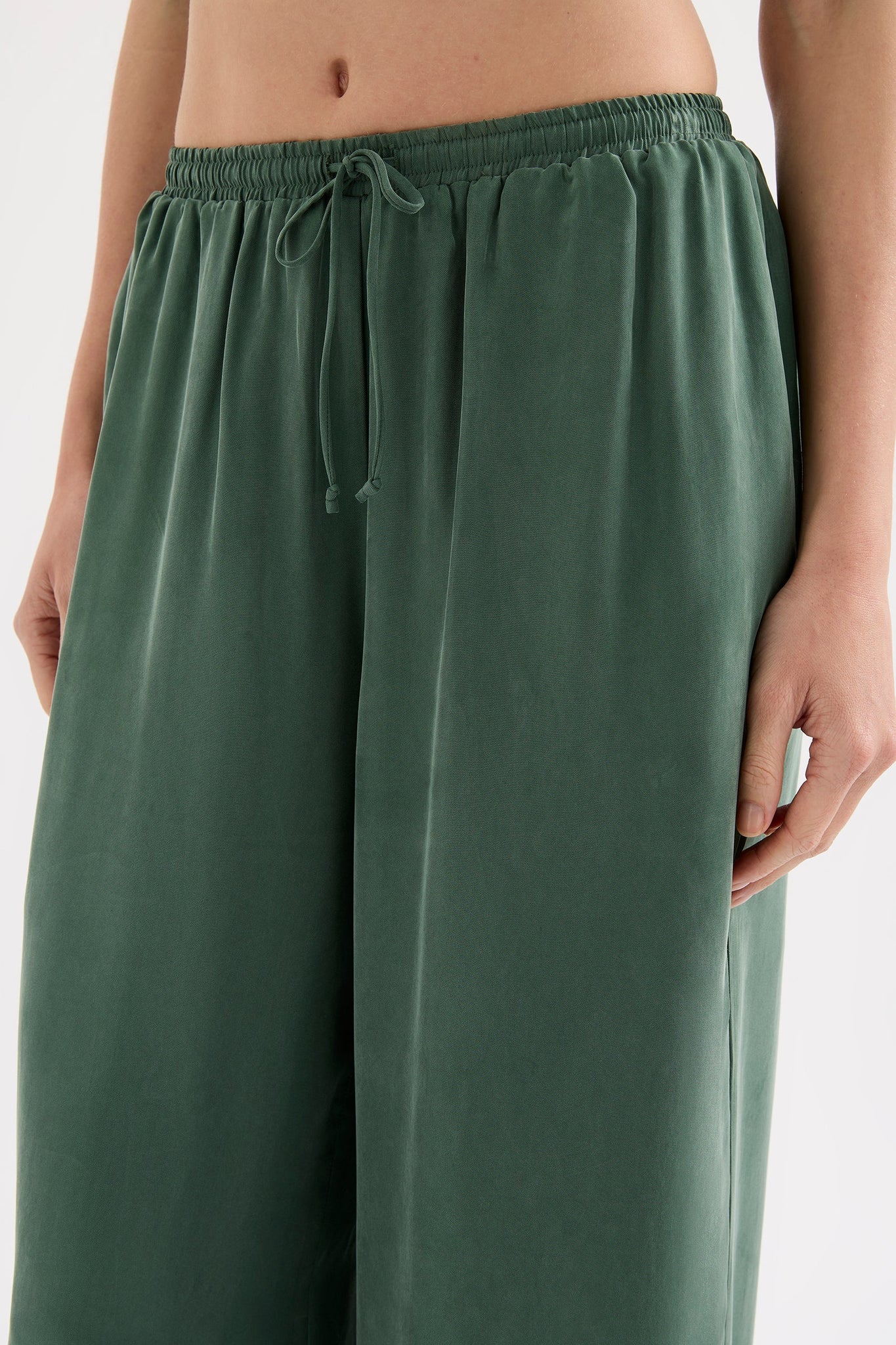 The Leon Cupro Pant is made in our signature premium cupro fabrication which has a soft, sueded hand feel. This pant has a relaxed, wide leg silhouette and features an elastic waistband, drawstring and side seam pockets.