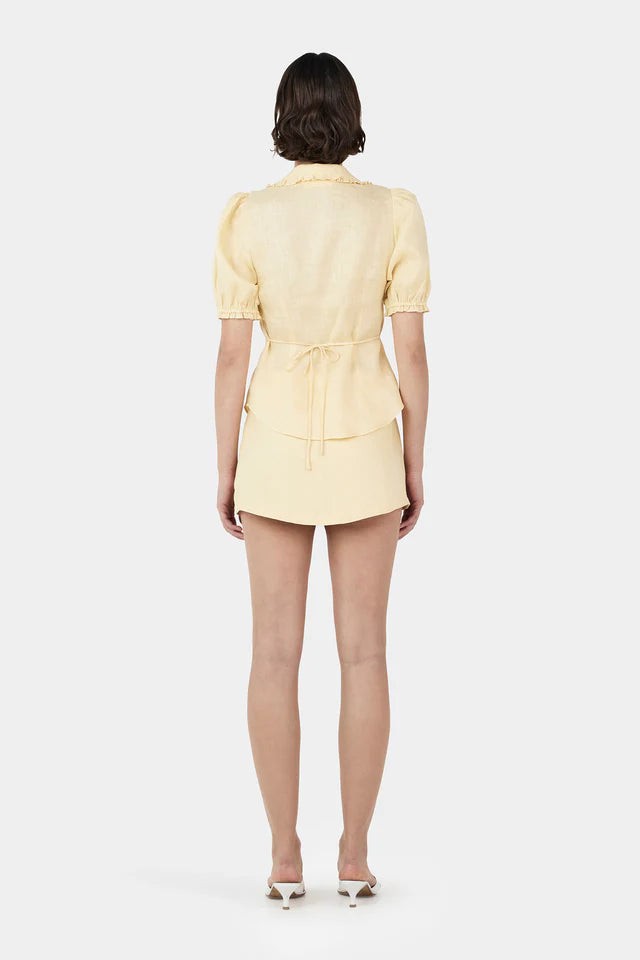 The Izzy Linen Shirt is a puff sleeve shirt with a Peter Pan collar and ruffle. A back tie allows you to cinch the waist for a more defined silhouette.