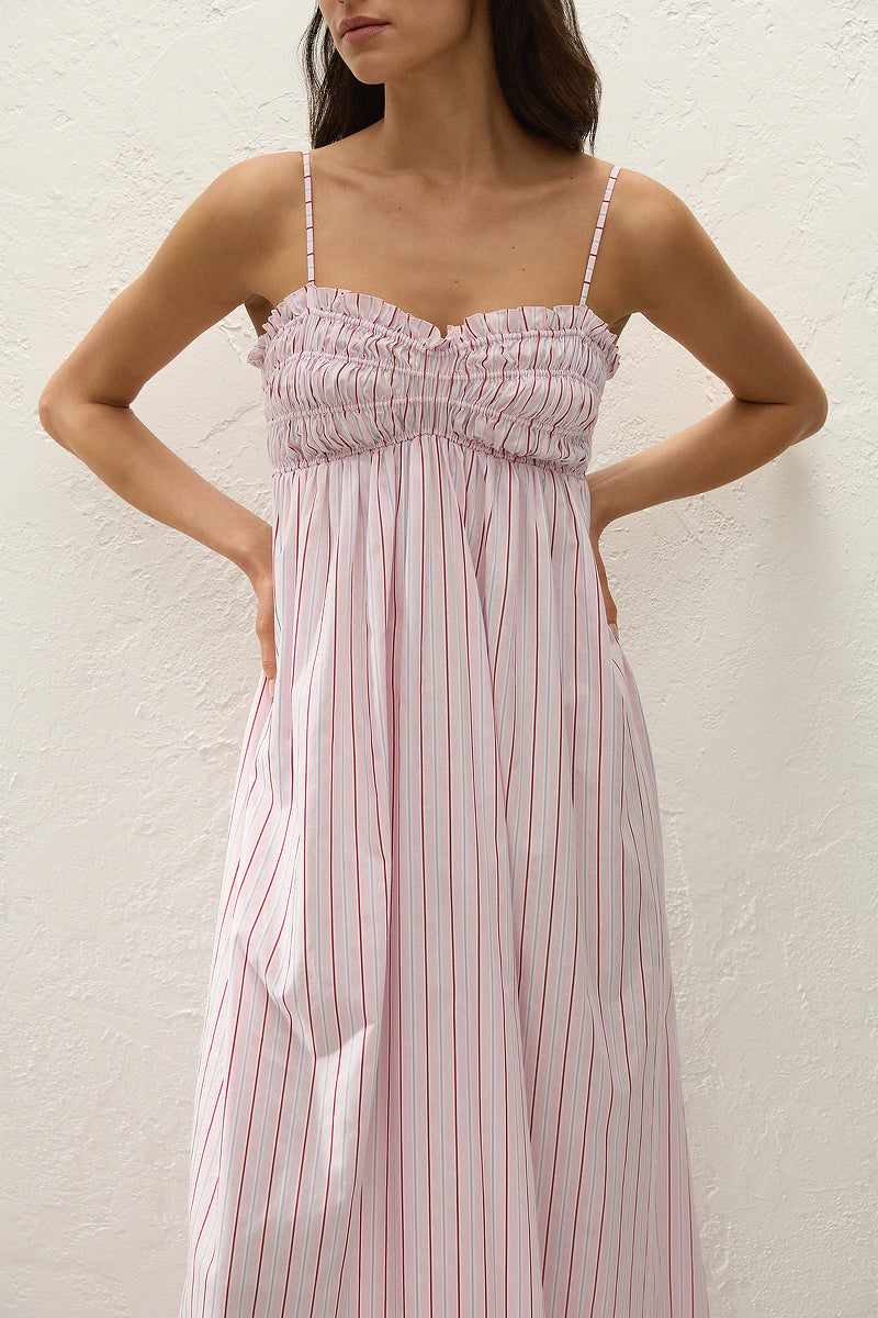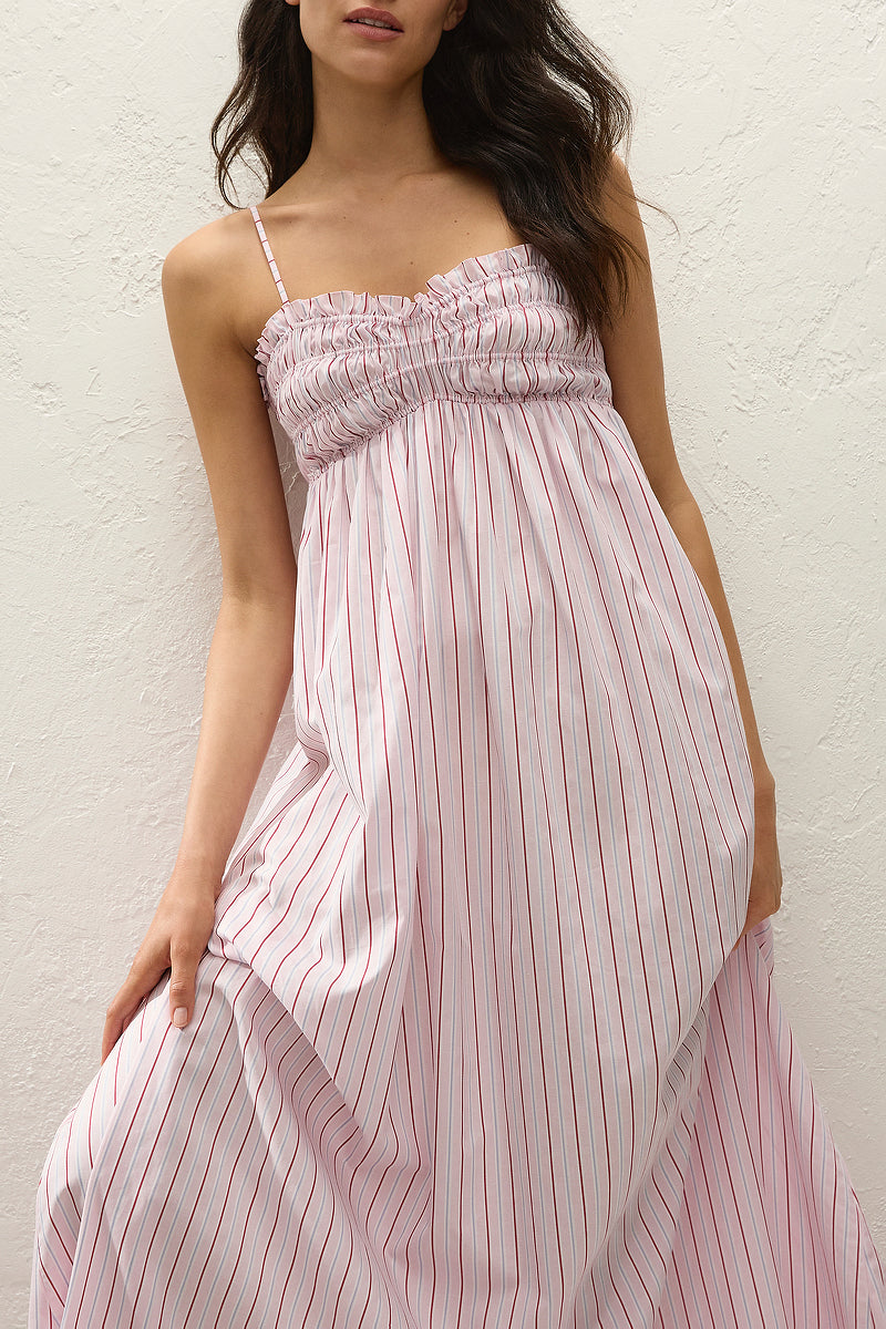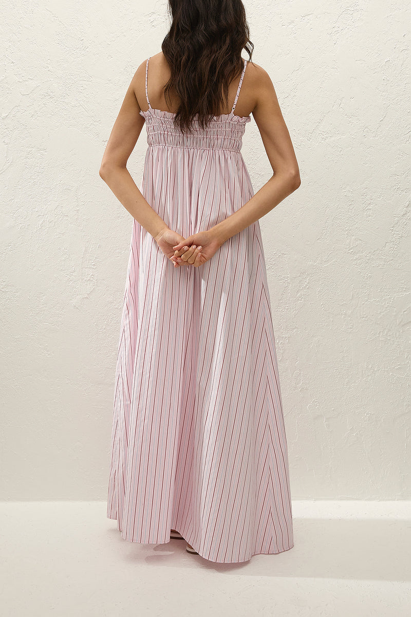 A vacation-inspired maxi dress, designed from a signature 100% cotton yarn-dyed in a beautifup Fiori Stripe Print. Ruched through the bust with a delicate frill detail along the neckline and thin straps, adjustable in length, it falls into a gathered empire waist with an A-line skirt. Lightweight with effortless appeal, style with a simple sandal for long sun-drenched days and balmy evenings.