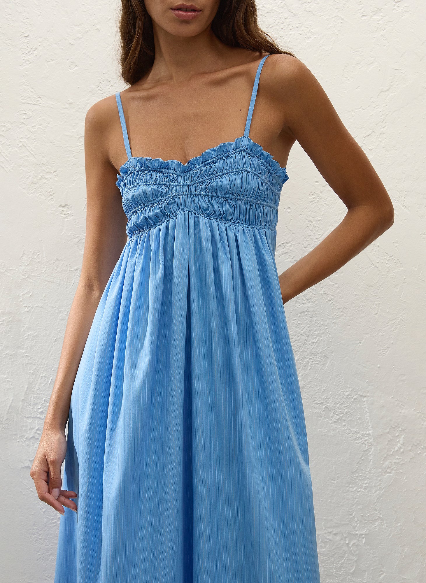 A vacation-inspired maxi dress, designed from a signature 100% BCI Certified organic cotton yarn-dyed in a vibrant azul blue stripe. Ruched through the bust with a delicate frill detail along the neckline and thin straps, adjustable in length, it falls into a gathered empire waist with an A-line skirt. Lightweight with effortless appeal, style with a simple sandal for long sun-drenched days and balmy evenings.
