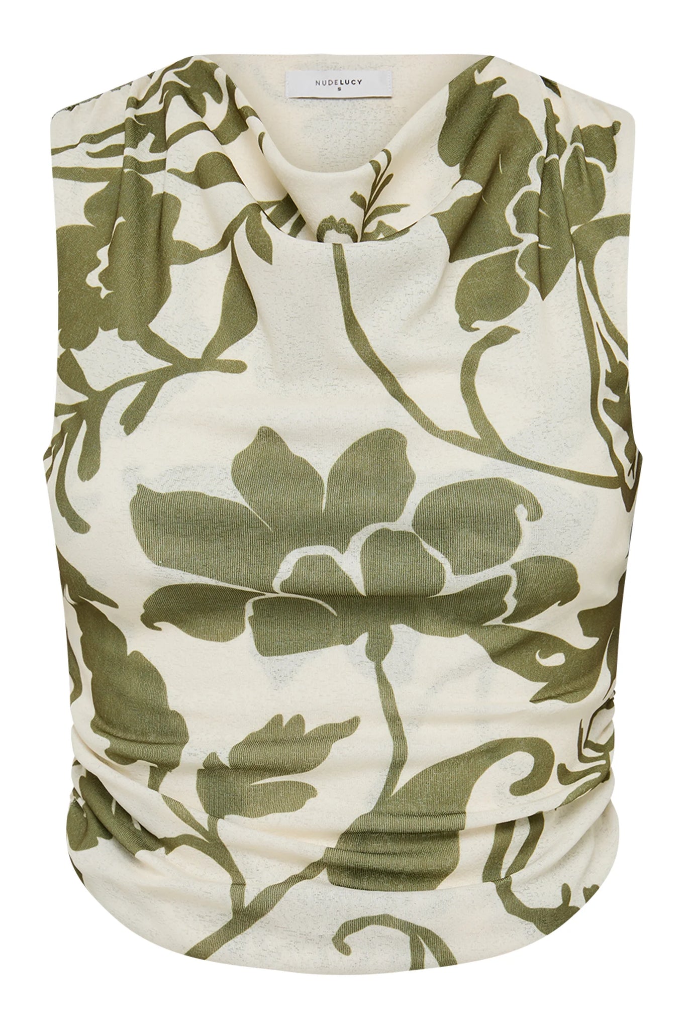 Features include a high cowl neckline and soft draped gathering across the body. This top is fully lined.
