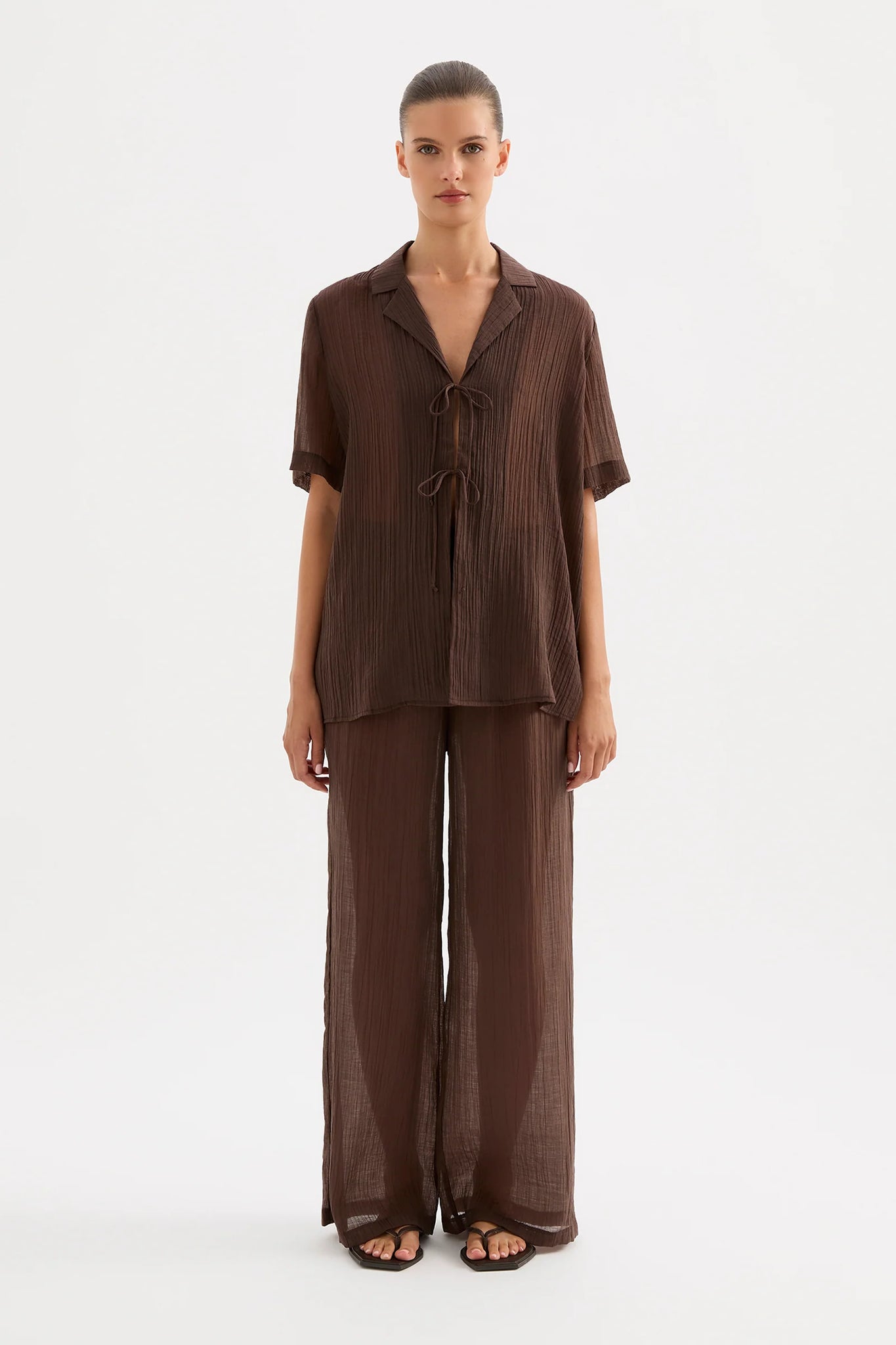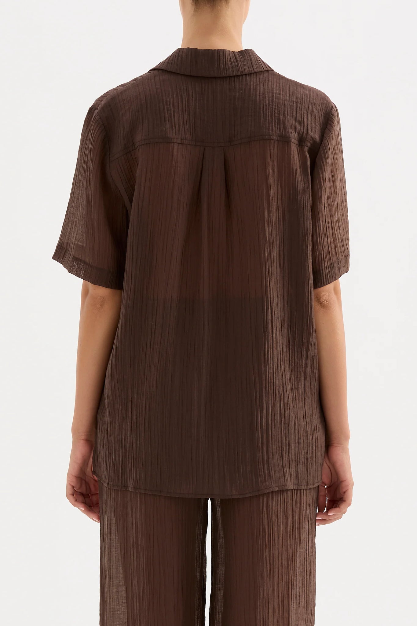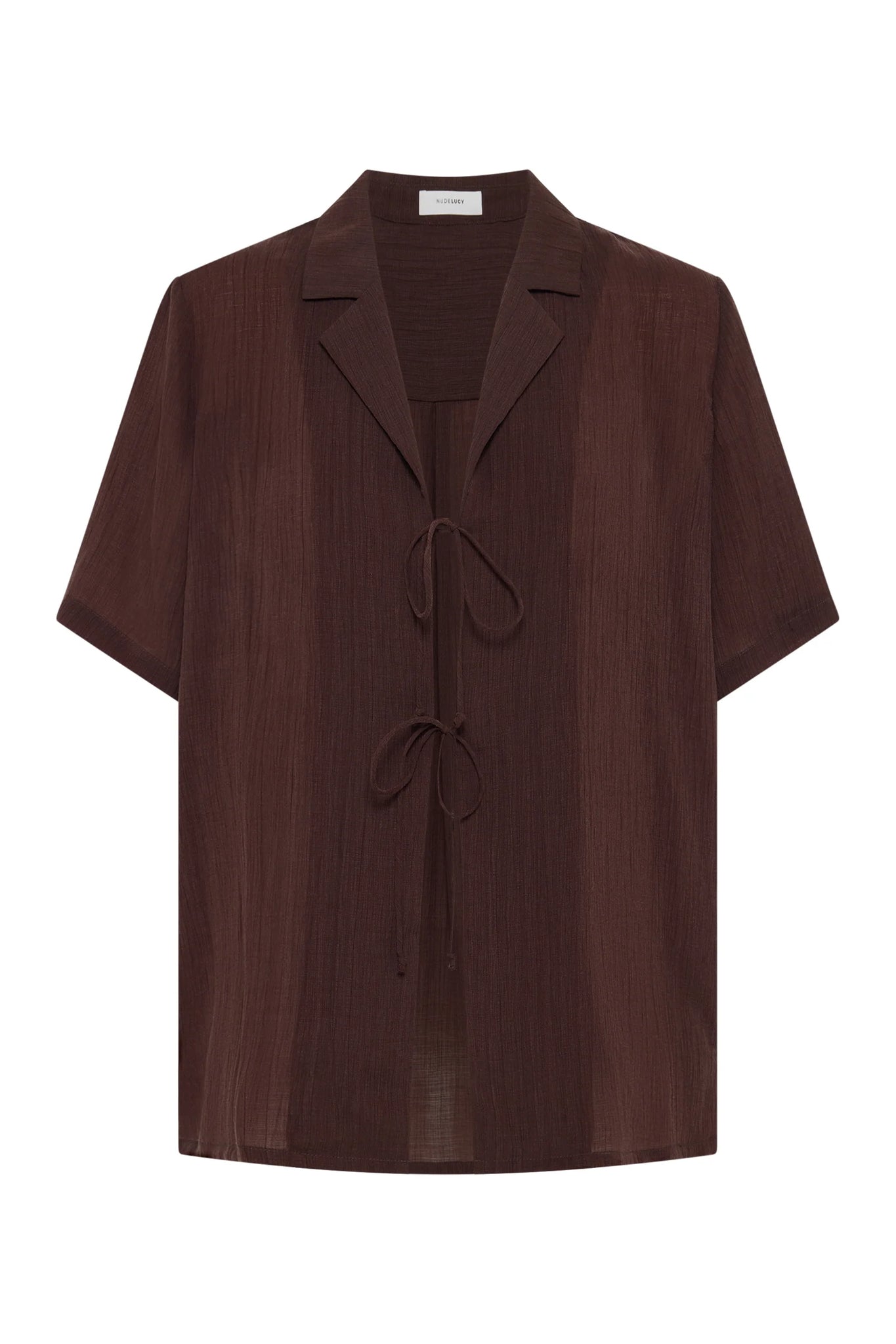 The Maxx Shirt is made from a lightweight, crinkled fabric which has a dry hand feel. The silhouette is an oversized fit, with length finishing at the hip. Features include classic shirting details, front tie closure and slits at hem.