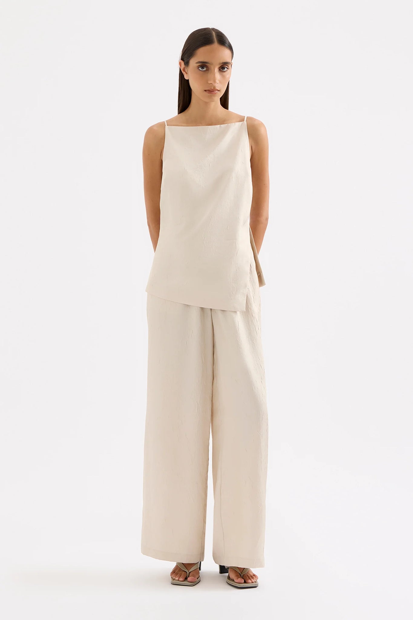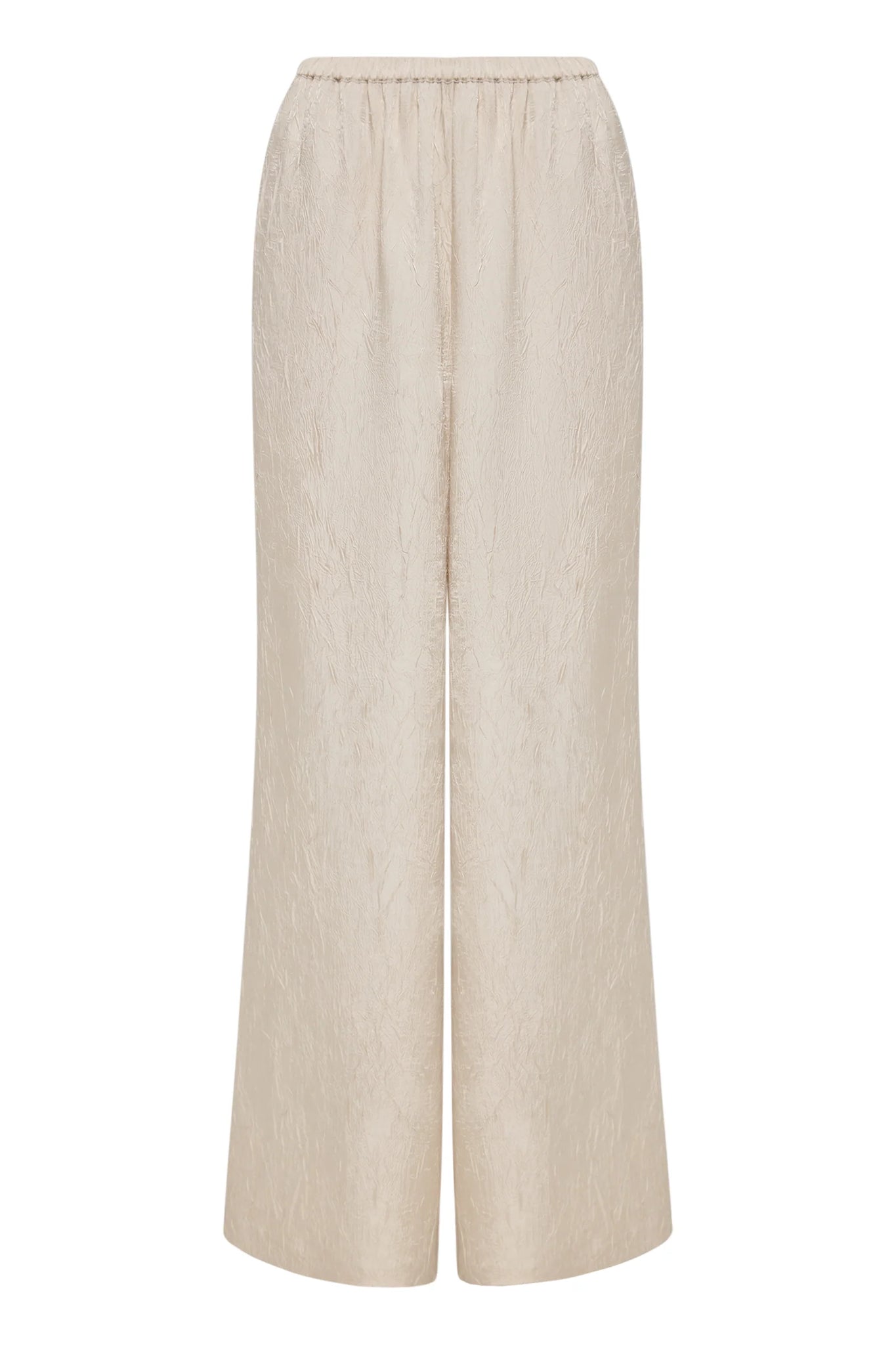 The Pandora Pant is made from a premium crushed satin featuring a luminous, gloss finish and subtle texture. The silhouette is relaxed with a wide full length leg. Features include an elasticated waistband and side seam pockets.