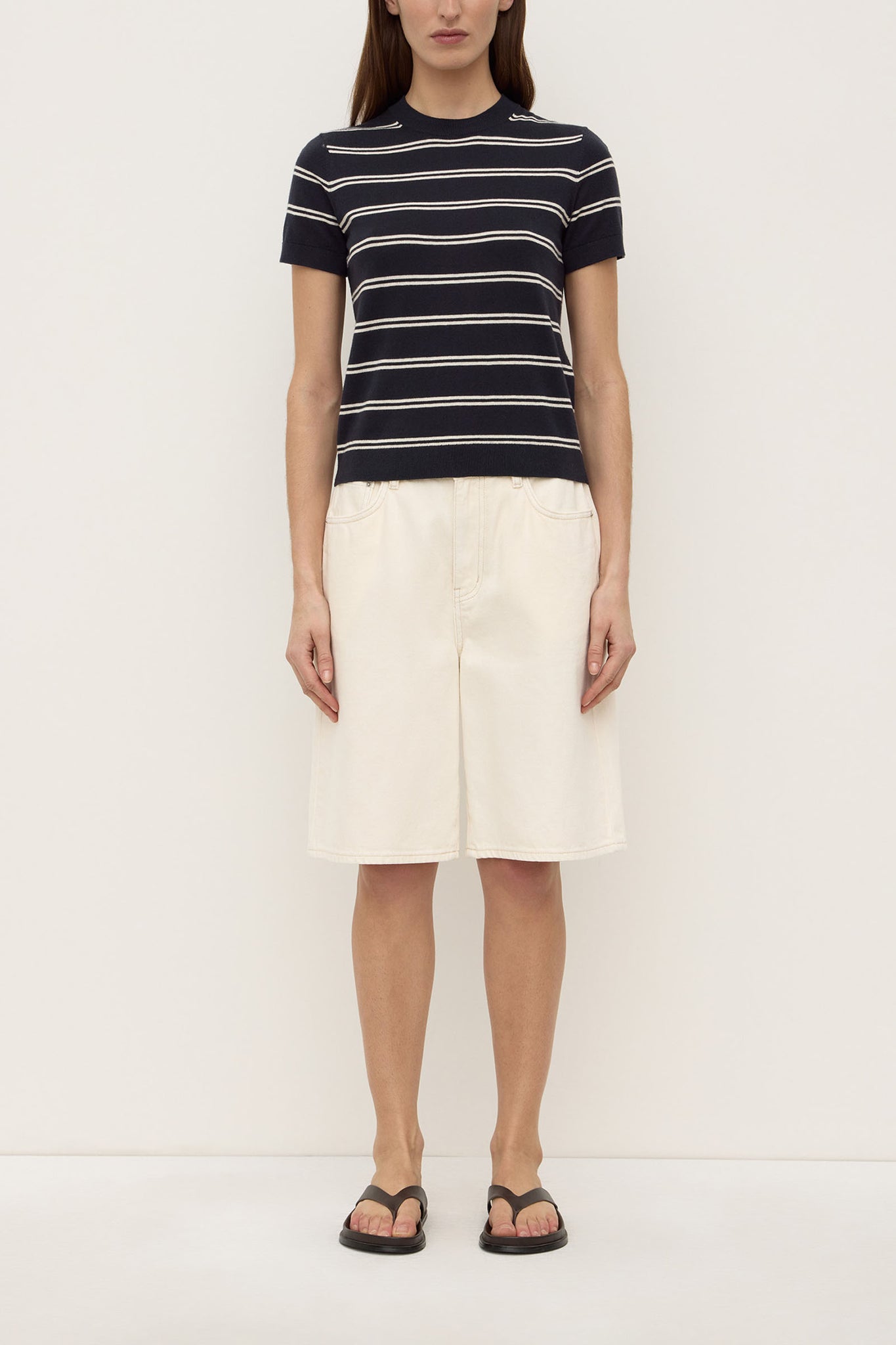 The Allison Stripe Cotton Cashmere Tee by Assembly Label in true navy and cream is a striped, relaxed fit tee with ribbed cuffs, neckline and hem.