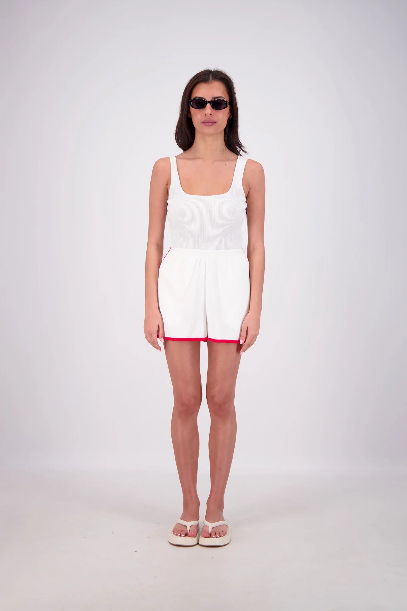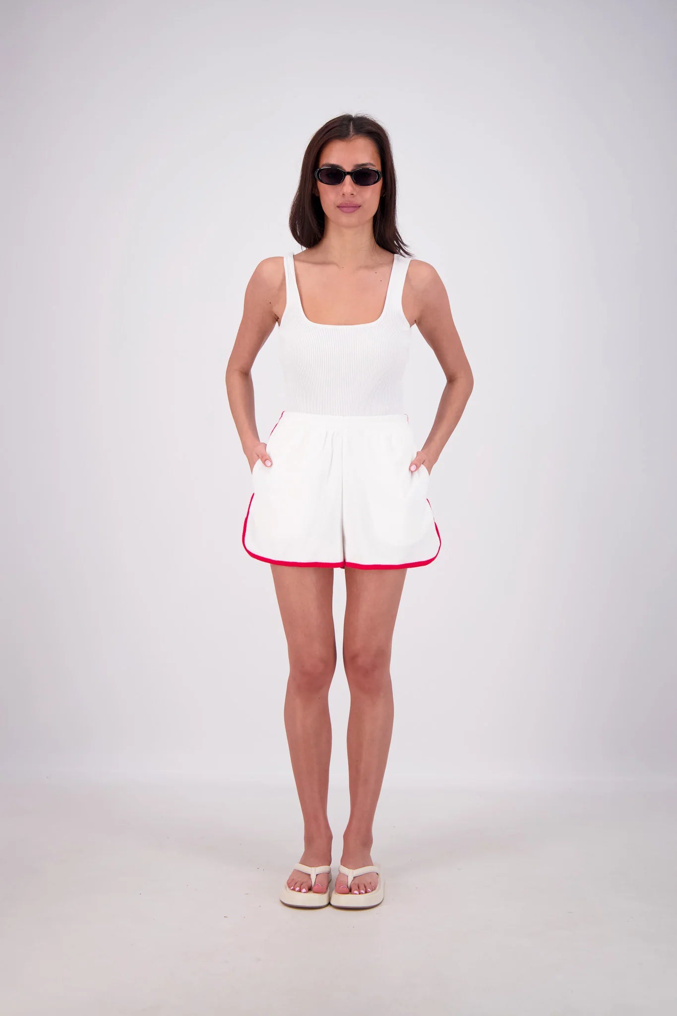 Experience all-day comfort with the Kuhio Shorts in White, crafted from soft cotton terry for a breathable, relaxed fit. Practical and stylish, they feature two side pockets and a striking contrast stripe detail. The elastic waistband offers a perfect fit, while the curved hem with side splits adds effortless movement. Designed to withstand frequent washing without losing shape, these shorts are your go-to choice this summer for easy, stylish wear every day.100% Cotton